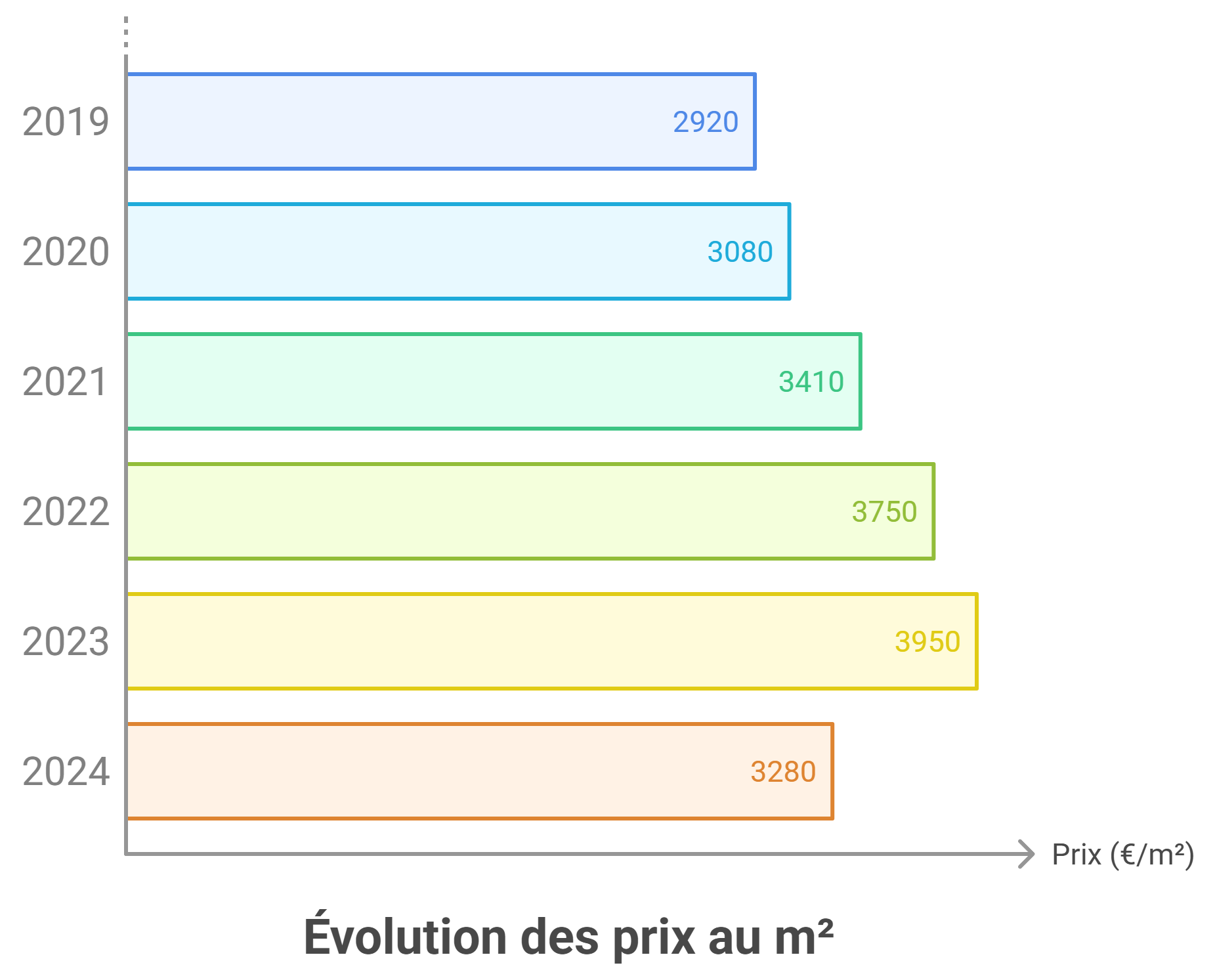 Environ 3 300 €/m² selon les ventes 2024, avec des variations selon le secteur et l’état du bien.
